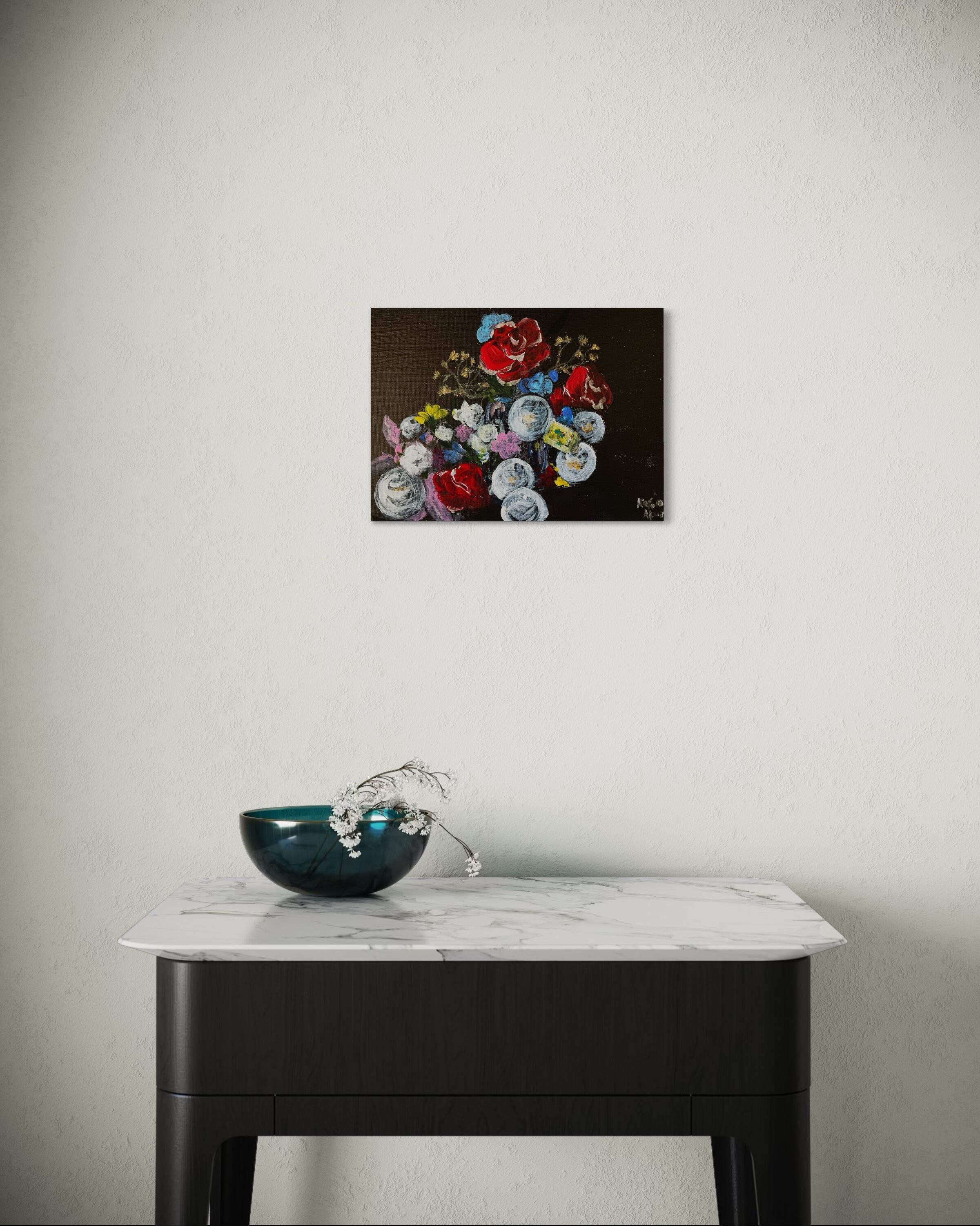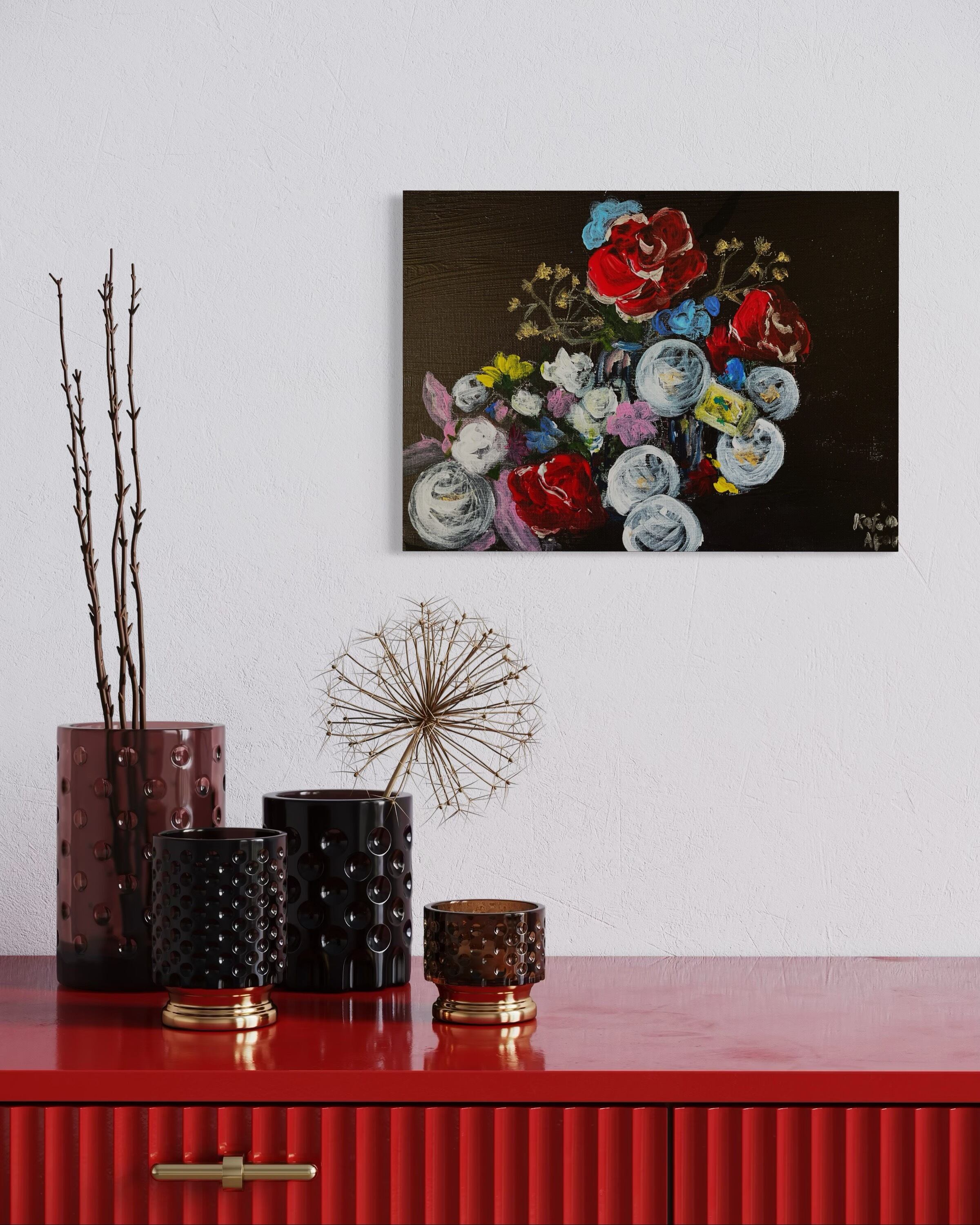 アクリル画, 花束, 静物画, 記憶装置, 祝福, 都市の祝祭, 現代アート, 即興絵画, 赤江かふお, 黒背景, グリッターアート, 記憶と代償, 現代の静物, 象徴絵画, F4キャンバス, 美と違和感, 花のアート, 質感表現, 彩色構成, 都市美学